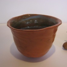 Faïence terra-cotta, intérieur engobé vert et bleu, forme évoquant la corolle d'une tulipe. Il a été fait avec amour et sa forme est unique. Il mesure 10 cm de haut pour 14 cm de diamètre et pèse 460 gr